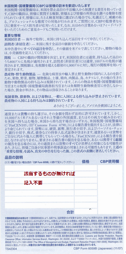 アメリカ税関申告書の裏面の記載方法としては、表面とは違い、至って簡単です。 表面で申告した、US$10,000を超える紙幣や硬貨やを持っているかどうか 日本やアメリカ以外で購入したもので、自身で持ち帰る予定のないものをアメリカに持ち込むものがあるのかどうかで、Yesにチェックした方のみ、裏面への記載が必要となります。