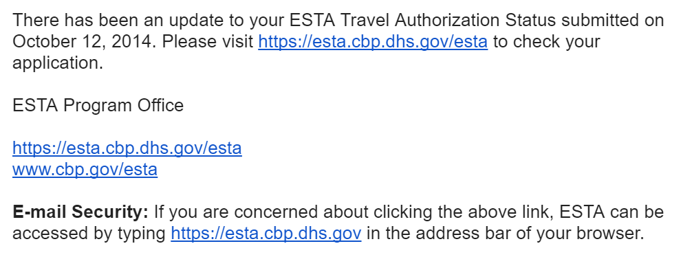 E-mail Security: If you are concerned about clicking the above link, ESTA can be accessed by typing https://esta.cbp.dhs.gov in the address bar of your browser.