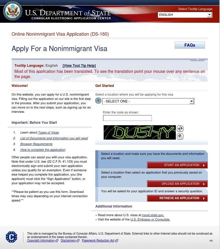 DS-160申請書フォームはすべて英語で入力します。ページ右上の"Select Tooltip Language"のプルダウンメニューから日本語を選択すると、マウスカーソルに合わせて和訳テキストが表示されるので参考にしてください。