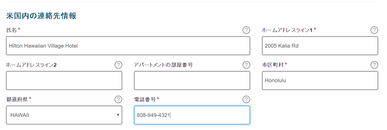 米国滞在中の住所についても上記の米国内の連絡先住所と同様にホテルに滞在する場合は、ホテル情報の入力で問題ございません。