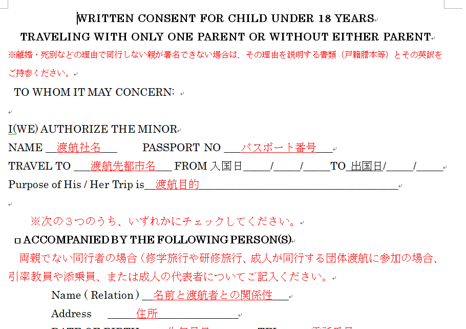 ※未成年者(18歳未満)が単独または片方の親同伴で米国へ渡航する際に必要です。
