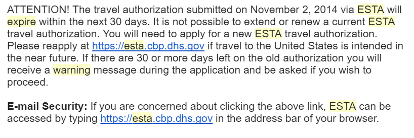 ATTENTION! The travel authorization submitted on June 2, 2014 via ESTA will expire within the next 30 days. It is not possible to extend or renew a current ESTA travel authorization. You will need to apply for a new ESTA travel authorization. Please reapply at https://esta.cbp.dhs.gov if travel to the United States is intended in the near future. If there are 30 or more days left on the old authorization you will receive a warning message during the application and be asked if you wish to proceed.